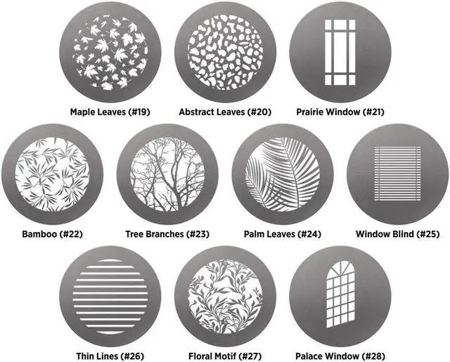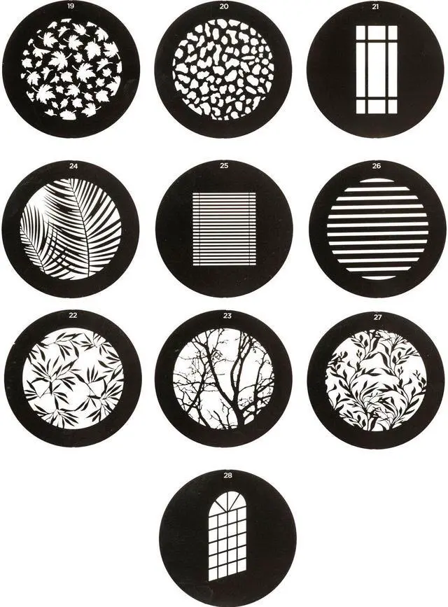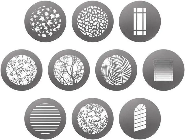 A versatile and innovative tool for photographers and videographers, the Environmental Gobo Pack for Optical Spot by Lindsay Adler, offers a unique way to project creative patterns onto your subjects or backgrounds. This 10-pack of high-quality gobos, designed by renowned photographer Lindsay Adler, is specifically crafted to pair seamlessly with the Westcott Optical Spot, a trusted name in professional photography equipment. Each 2.6" ( 6.6 cm) metal disc in this pack features a distinct pattern cutout, providing a diverse range of options for creating dramatic special effects, subtle textures, and artistic patterns.
