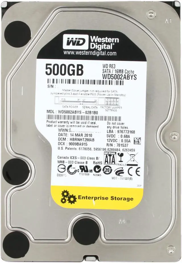 Western Digital RE3 WD5002ABYS 500GB 7200 RPM 16MB Cache SATA 3.0Gb/s 3.5" Internal Hard Drive Bare Drive