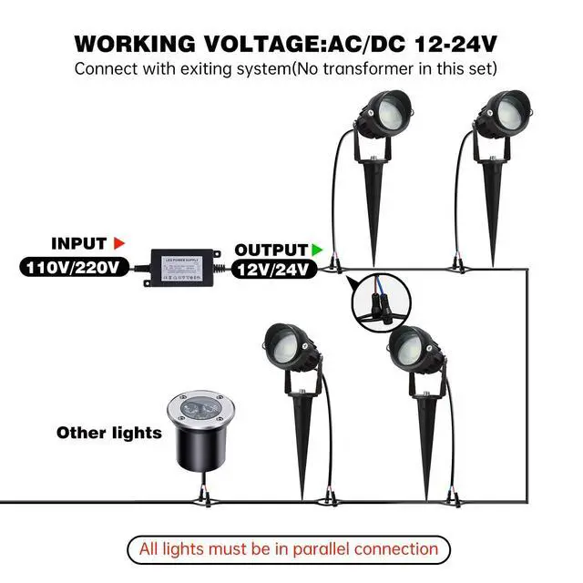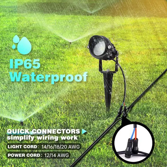 10W Landscape Lights Working Temperature: -4 °F~130 °F . Waterproof levels : IP65 . Tight seals waterproof design, greatly improve the stability of outdoor lighting and long-term use, perfect for outdoor landscape path & deck lighting.