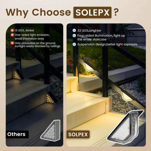 33 LEDsEvery solar stair light comes with 33 LEDsway more than ordinary ones on the market, keeping steps brighter and your night walks safer.