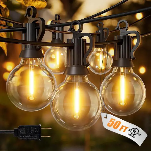 50ft LED Connectable String Lights - This outdoor light comes with 25+2 G40 LED bulbs. Each bulb is 2 feet apart for a total length of 50 feet. It supports an end-to-end connection of up to 14 strings, allowing you to customize the length you need. These lightweight and convenient patio lights are easy to carry and store