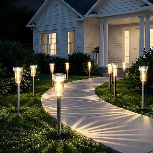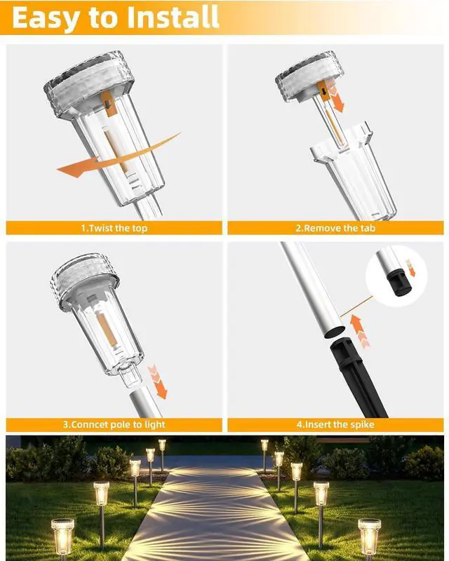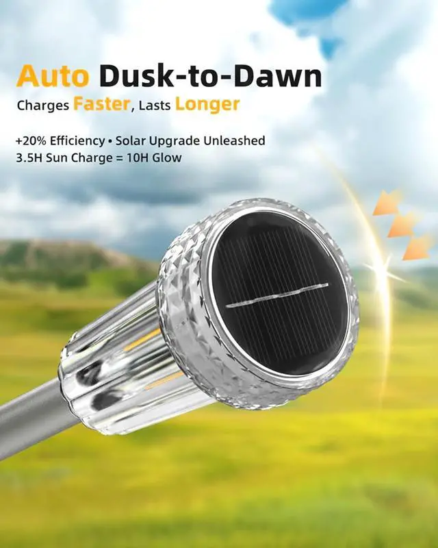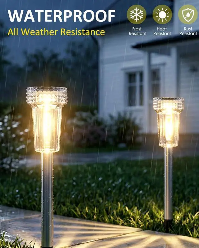 Waterproof & Durable: Constructed with stainless steel pole and heavy-duty ABS resin-grade transparent housing ,the durable stainless steel poles offer superior strength and resistance to rust and corrosion, the plastic lamp covers are treated with a UV-resistant coating to prevent fading.these solar pathway lights resist extreme weather conditions, including torrential rain, snowstorms, and prolonged UV exposure. making them ideal for prolonged outdoor use and preserving their elegant appearance over time