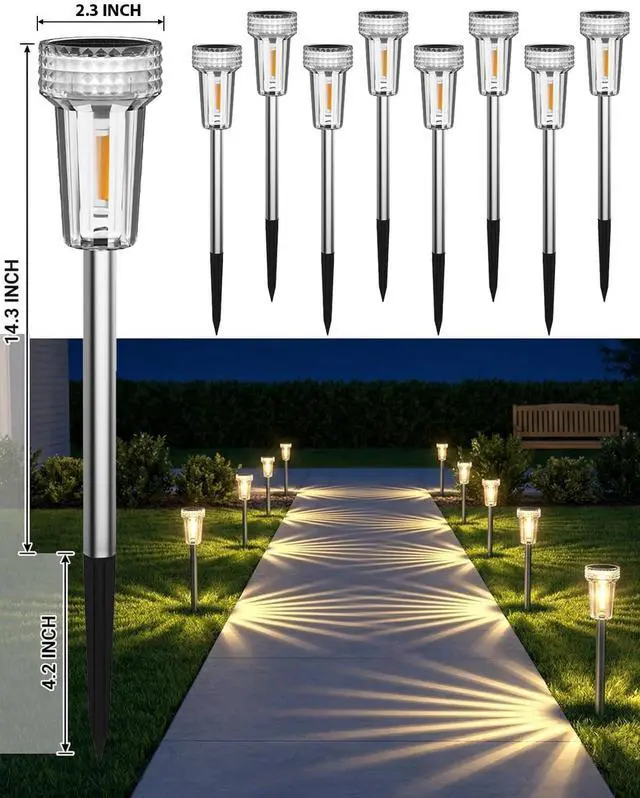 12 Pack Solar Pathway Lights Outdoor, Auto Dusk-to-Dawn Landscape Garden Lighting, Waterproof Stainless Steel Pole Lighting for Path, Yard, Walkway, Garden, Driveway Decor - Warm White