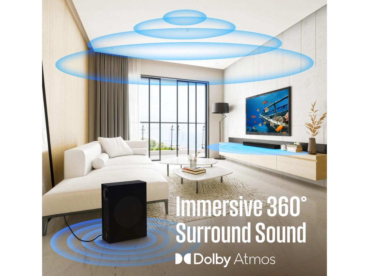 - Dolby Atmos Up-Firing Height Speakers and Side-Surround Speakers - The adaptive Height Speakers integrated into the soundbar automatically rotate up or forward to create a more immersive and three-dimensional sound experience. Dolby Atmos treats sound as individual objects that can be placed and moved anywhere in your room making it feel as if sounds are coming from above, behind and all around you.