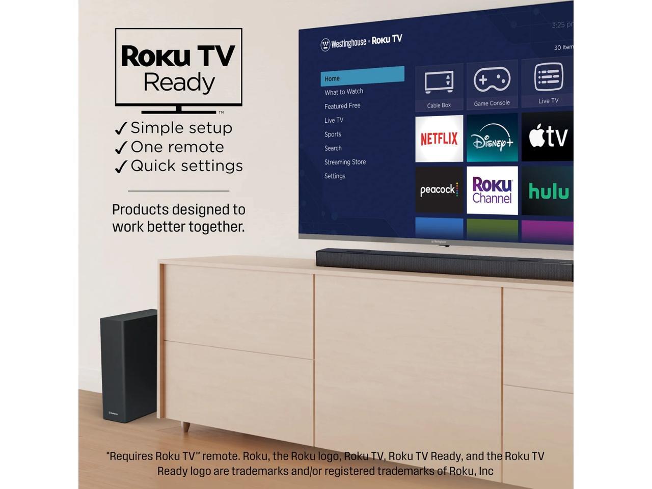 - Roku TV Ready Certified Soundbar: Designed to work seamlessly with your Roku TV. Westinghouse sound bars are Roku TV Ready certified. That means you’ll enjoy a smooth and simple setup, easy access to sound settings, and compatibility with any Roku remote.