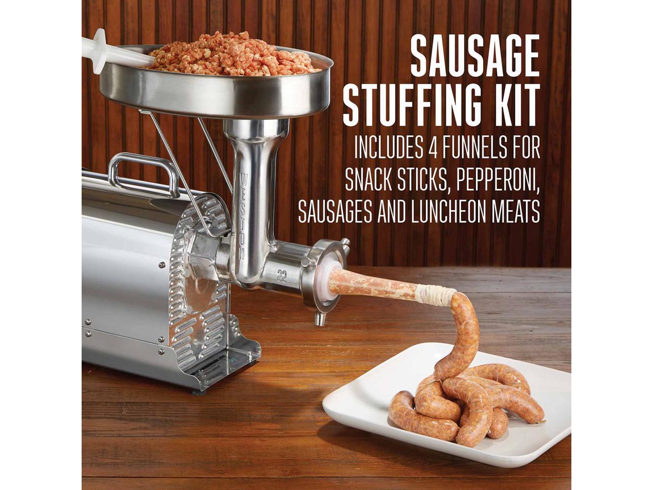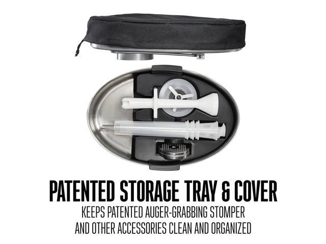 - Includes patented auger-grabbing stomper and other accessories, patented storage tray with cover, and a sausage making kit