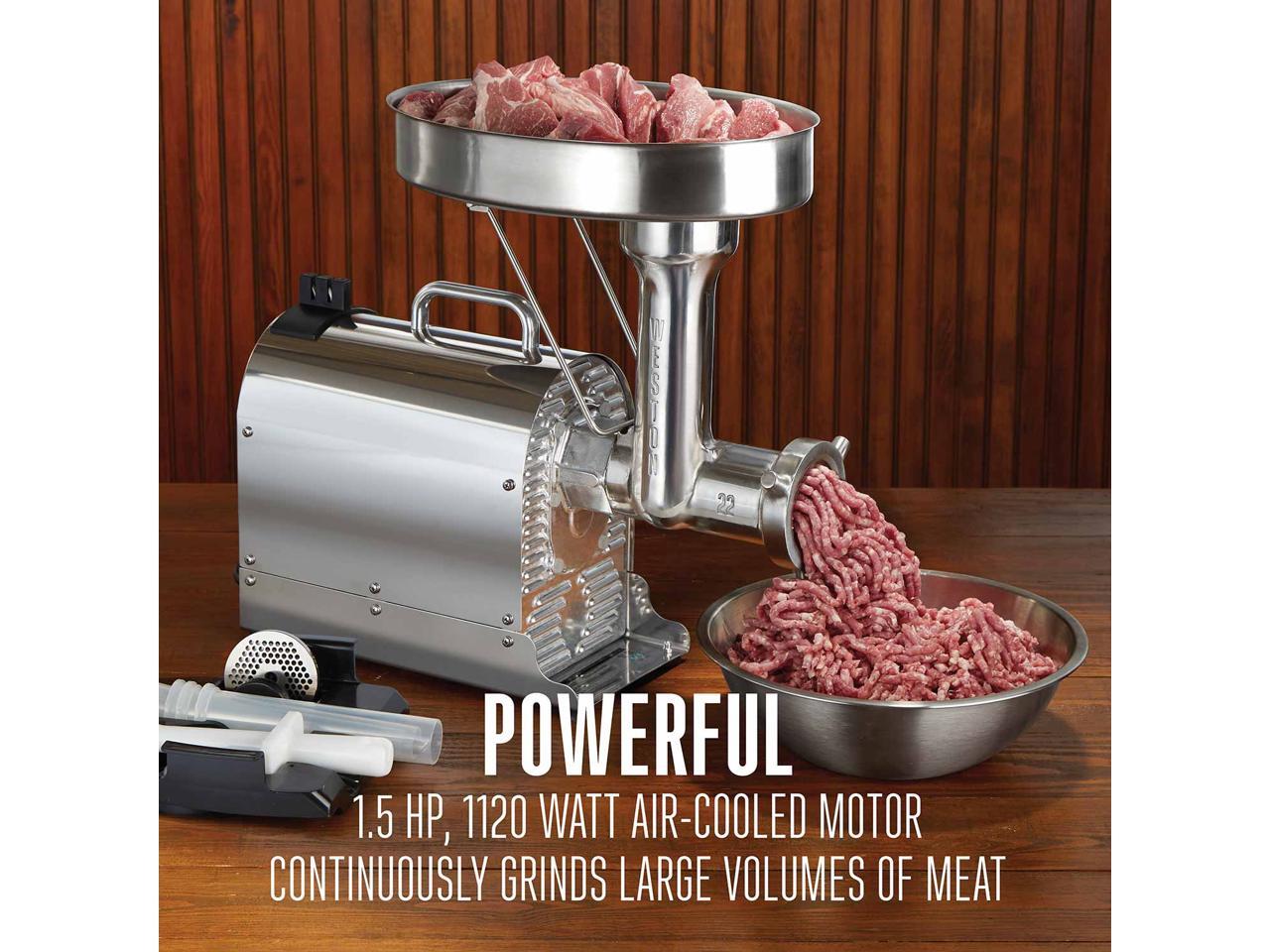 - Powerful 1.5 hp, 1120 watt motor continuously grinds large volumes of meat without stopping