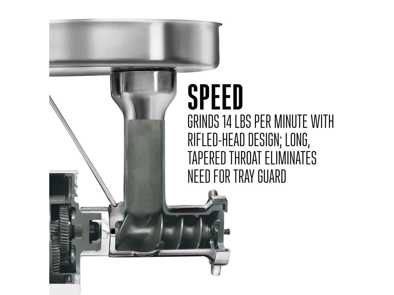 - Fast grinding - grind 14 pounds of meat per minute with rifled-head design and long tapered throat that eliminates the need for a tray guard