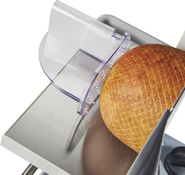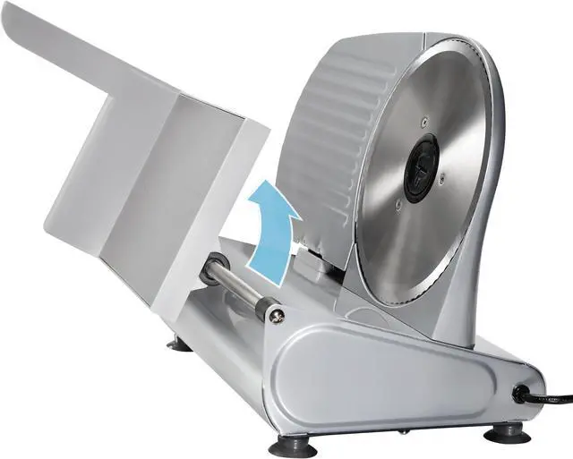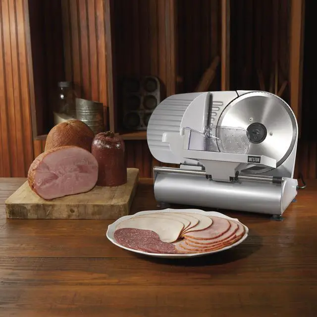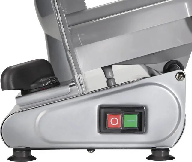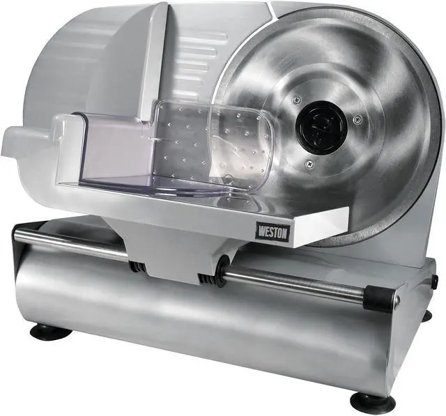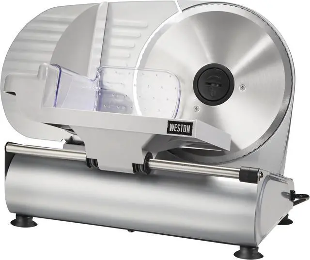 | Features | The Weston Heavy Duty 9" Food Slicers features a high quality removable Stainless Steel blade, powered by a rugged, quiet running motor that slices through all of your meats and vegetables quickly and easily Compact design for easy storage and transportation High quality, 8.63" rotary, Stainless Steel blade for precision slicing Quiet running motor Removable blade for easy cleaning Smooth gliding, large capacity, Stainless Steel food tray tilts out for easy cleaning Corrosion resistant coated steel and aluminum housing Sturdy base and suction cup feet for stable and safe operation Food pusher with teeth for controlled slicing Adjustable thickness control for slicing from deli-thin to over 0.5" thick On/Of Safety Switch |