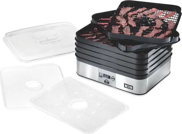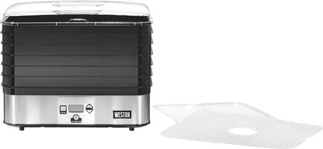 | Features | The Weston 6 Tray Digital Food Dehydrator Plus is the perfect tool to preserve foods for later use. Use to dry the season's harvest for meats, making jerky and a variety of snacks. Ideal for making banana chips, fruit rollups, dried herbs, fruits & vegetables. The adjustable digital thermostat lets you adjust the drying temperature from 100-160 degrees, and has a 48 hour timer with automatic shut off. The continuous air flow provides even drying for better taste. Includes one fine-mesh sheet for drying small foods like herbs, and one solid sheet for making fruit roll ups. 800 watts. 7.4 square feet of drying space. Includes 6 BPA free trays, 1 sold tray for making fruit leather, and 1 mesh screen for drying herbs. |