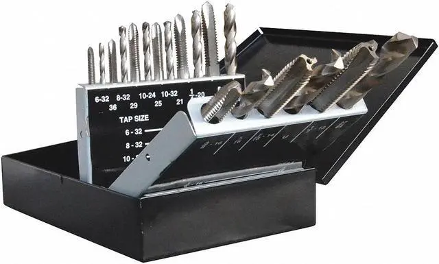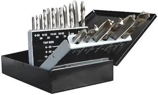 Drill Bit and Tap Set, Number of Pieces 18, Tap Type Hand Tap, Drill Bit Material High Speed Steel, Drill Bit Finish Bright (Uncoated), Drill Bit Dia. Included #21, #25, #29, #36, #7, 27/64 in, 5/16 in, F, U, Measurement System Fractional Inch, Letter, Wire, Drill Bit Point Angle 118 Degrees, Impact Rated No, Smallest Drill Bit Dia. #36. This item has been restricted from sale in the following state (s): []