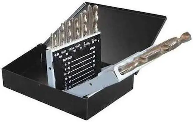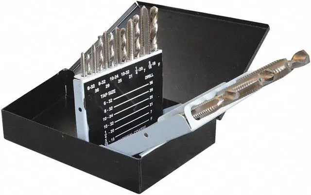 Drill Bit and Tap Set, Number of Pieces 18, Tap Type Hand Tap, Drill Bit Material High Speed Steel, Drill Bit Finish Bright (Uncoated), Drill Bit Dia. Included #21, #25, #29, #36, #7, 27/64 in, 5/16 in, F, U, Measurement System Fractional Inch, Letter, Wire, Drill Bit Point Angle 118 Degrees, Impact Rated No, Smallest Drill Bit Dia. #36. This item has been restricted from sale in the following state (s): []