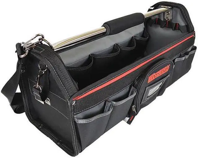 California Proposition 65: This product contains a chemical known to the State of California to cause birth defects or other reproductive harm. Tool Tote, Bag Style Tote, Material Polyester, Closure Type Open Top, Number of Bags 1, Overall Height 10 in, Overall Depth 8 in, Overall Width 23 in, Overall Diameter 8 in, Reinforced Bottom Reinforced Bottom Included, Color Black, Shape Rectangle, Compatible Modular System Not Applicable, Drain Holes Drain Holes Not Included, Features Padded Handle, Rigid Frame, Includes Carabiner, Electrical Tape Loop, Shoulder Strap, Tape Clip, Includes Laptop Pocket Laptop Pocket Not Included. This item has been restricted from sale in the following state (s): []