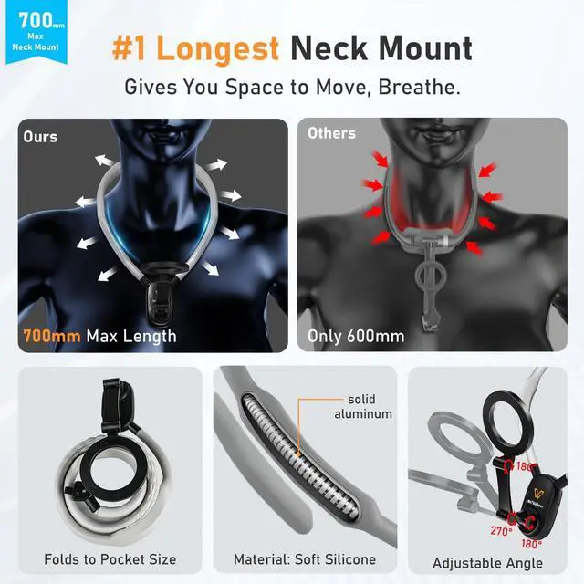 Neck Phone Holder for Recording, 700mm Extended for Comfort, Hands-Free POV/Vlog Magnetic Neck Mount with Anti-Shake Chest Strap, Content Creator Essential, Compatible with iPhone, Android, GoPro