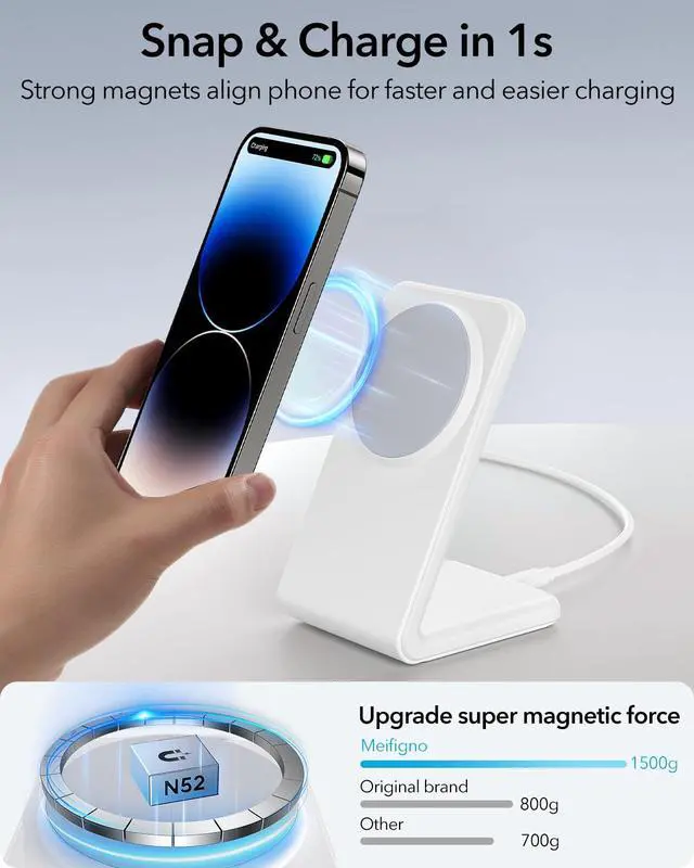 Comes with 20W USB-C Charger Block and Type-C Cable A complete set of one purchase = magsafe-compatible charger stand + USB-C PD3.0 20W adapter + charging cable! Designed for iPhone 17 Pro Max/17 Pro/17 Air/17/ iPhone 16 Pro Max/16 Pro/16 e/16 Plus/16/ iPhone 15 Pro Max/ 15 Pro/ 15 Plus/ 15/ 14 Pro Max/ 14 Pro/ 14 Plus/ 14/ 13 Pro Max/ 13 Pro/ 13/ 13 mini/ iPhone 12 Series, Designed for AirPods 4/ AirPods Pro 2/ AirPods Pro/ AirPods 3/ AirPods 2(wireless charging version)