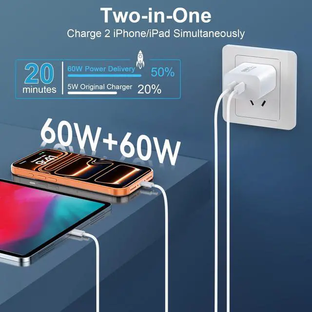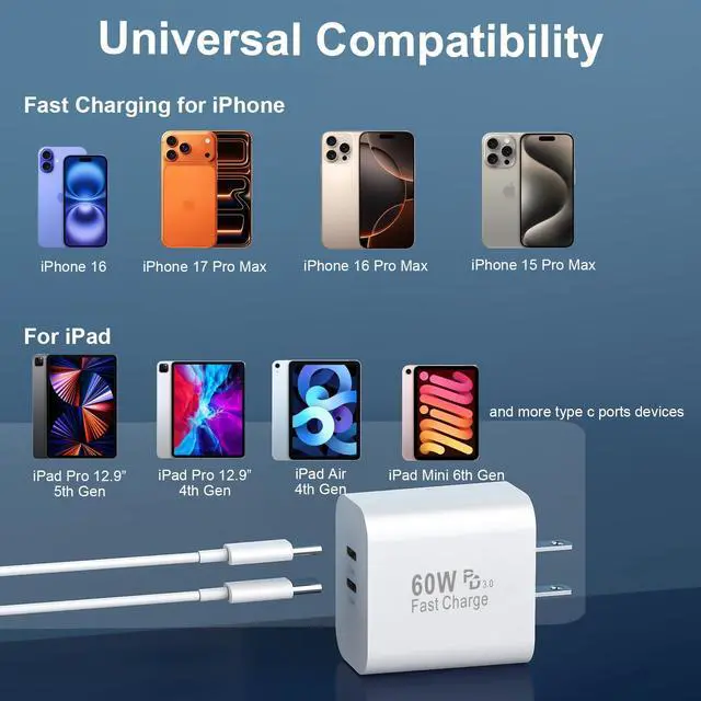 Dual Port 60W USB C Fast Charger Block: This usb c wall charger block with two independent output port, charge two of your usb-c device like phone 17 pro max and Pad simultaneously at up to 60W without sacrificing charging speeds