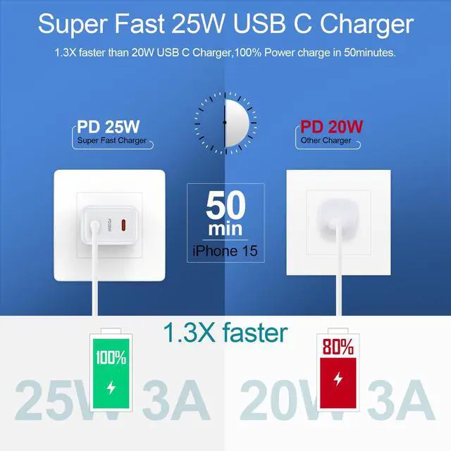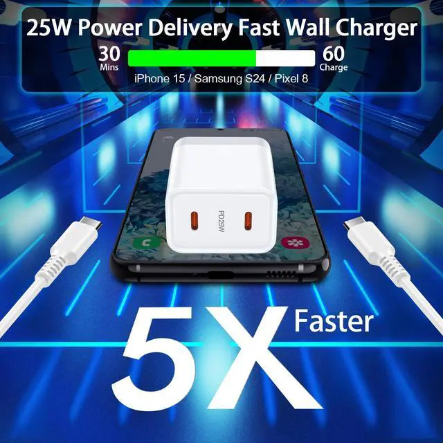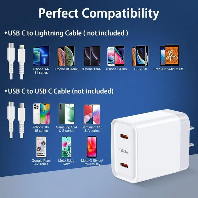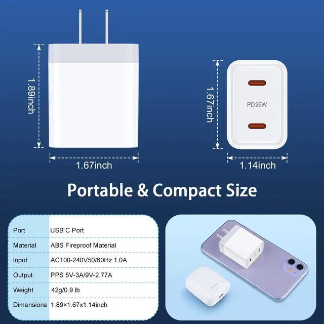 • Fully Compatible: 25W 2 port usb c wall charger super fast charges for all devices which support QC4.0 QC3.0 QC2.0 and PPS PD 3.0 protocol, like cell phones, tablets, pad. Compatible for iPhone 17 Pro Max,17 Pro,17,iPhone Air,iPhone 16e, iPhone 16 Pro Max,16 Plus,16 Pro,16,iPhone 15 Pro Max,15 Plus,15 Pro,15; Google Pixel 10 Pro XL/Fold 10 9 Pro XL, 9 Pro; Samsung Galaxy A15 5g A35 A55 A25 S24 ultra S24 plus S24, Z Fold 6 5,Z Flip 6 5,A24 4G,A14 5G A13, A54 A34 A53 A03s S23 S21 and more