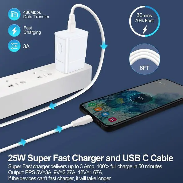 4.Type c charging adapter provides max 25W output power, charging samsung a16 up to 70% in just 30 minutes,Full charging about 50mins.