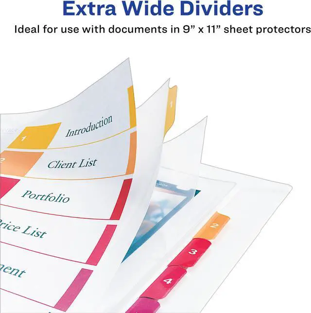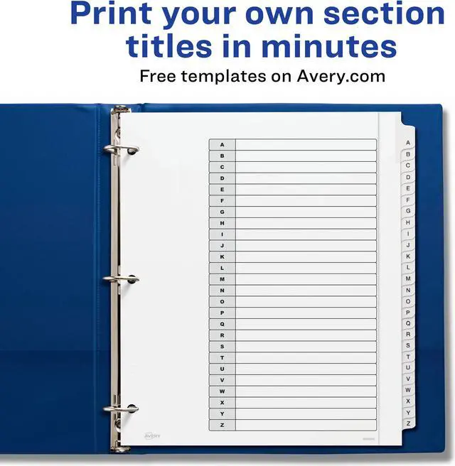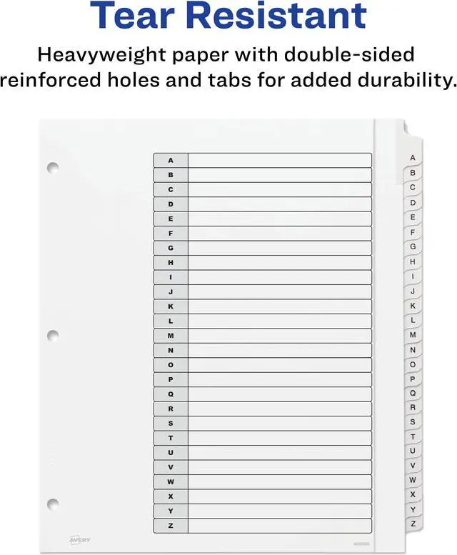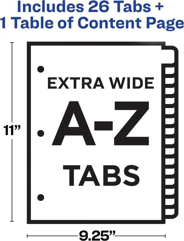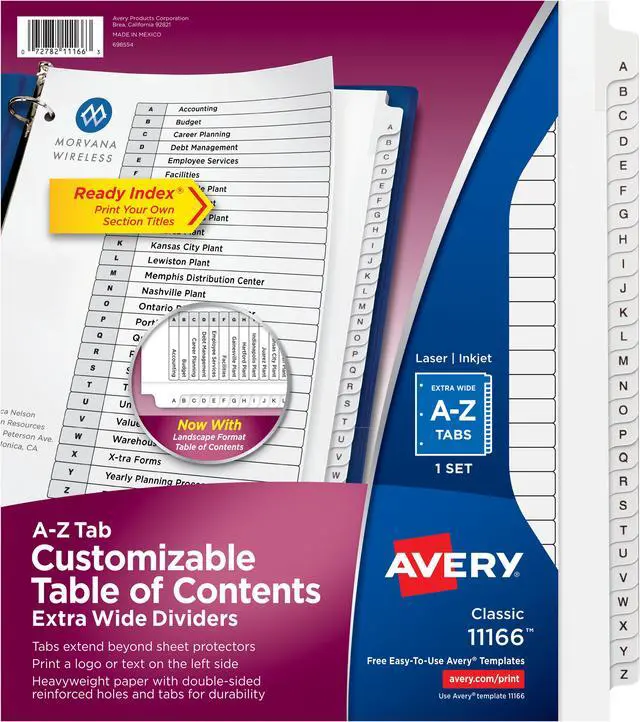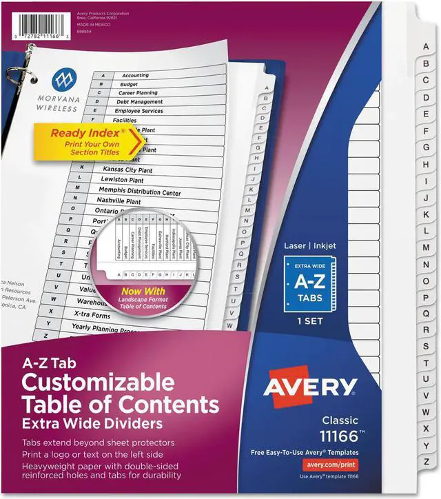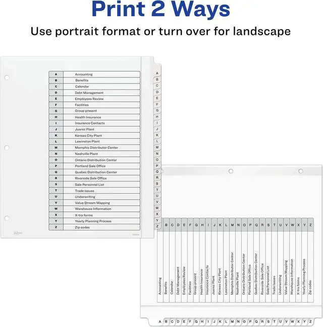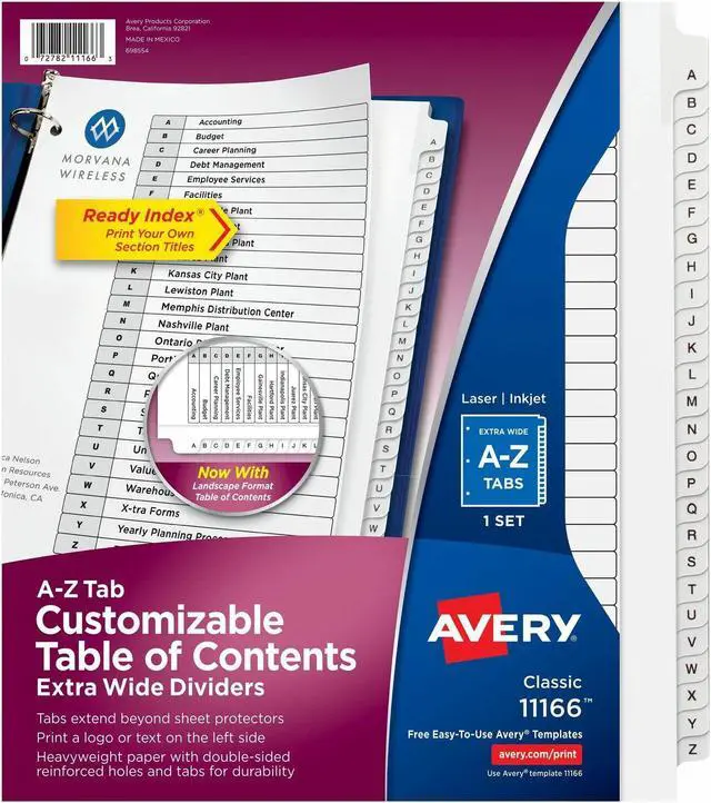 Organize documents quickly and easily with extra-wide dividers that are ideal for documents in 9" x 11" sheet protectors. A reinforced table of contents page and coordinating preprinted tabs make referencing easy while offering a professional look. Customize the table of contents page with section titles as well as graphics or a company logo. Heavyweight paper with extended tab reinforcement and double-sided hole reinforcement prevents tearing even with frequent use. Extra-wide A-Z Ready Index Dividers can be used in portrait or landscape formats. Easily customize with free online templates and designs using Avery Design and Print. They are compatible with laser and inkjet printers.