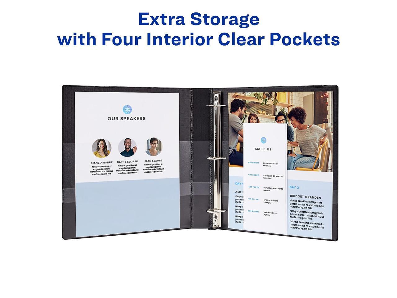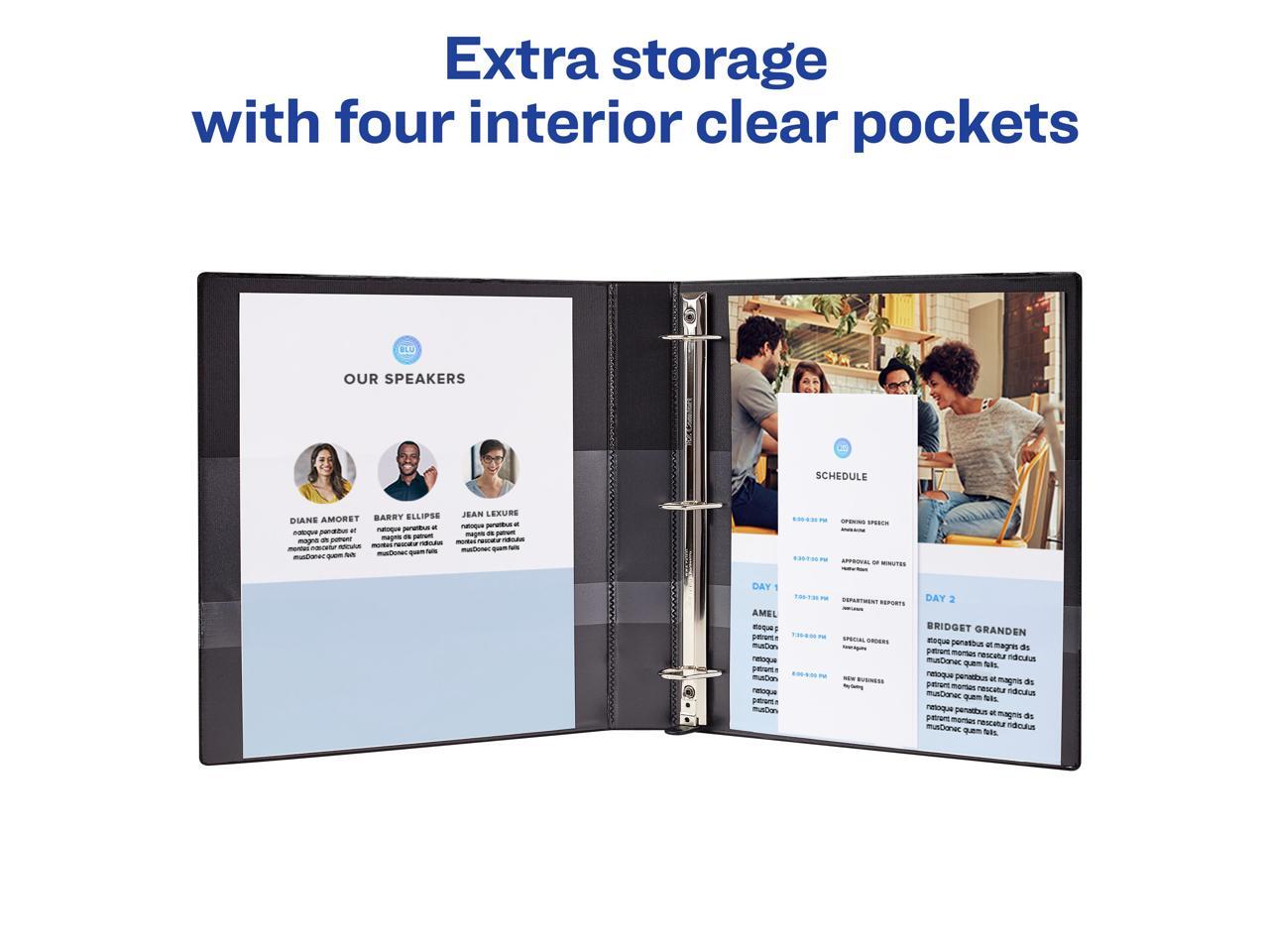 - Heavy-Duty binders have a DuraHinge design that's stronger, lasts longer and resists tearing, while the DuraEdge feature makes the sides and top more pliable to resist splitting. Organize and store loose papers in the four clear interior pockets.