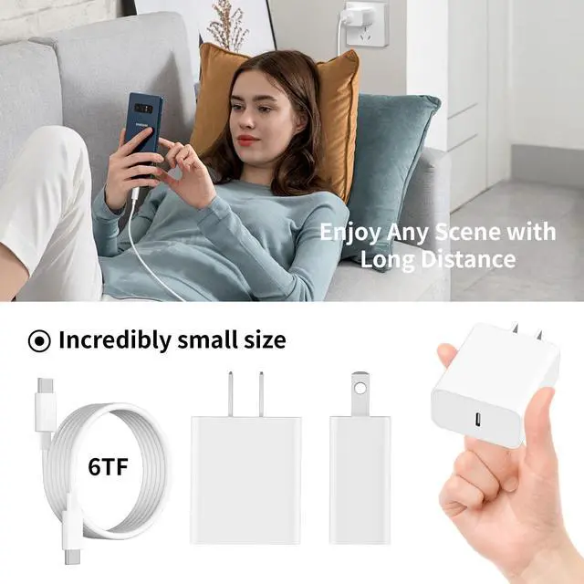 20W USB C Charger Fast Charging Block with MFi Certified 6FT USB C to C Fast Charger Cable for iPhone 15/iPad Pro, iPad Air, iPad Mini, Samsung Galaxy, Google Pixel and More 20W USB C Fast Charger Set Specification: Power: 20W max Input: 100-240V, 50-60Hz0.6A Output: 5V---3A or 9V---2A or 9V 2.22A or 12V---1.5A USB C Cable Length: 6FT Material: TPE Flexible Cord + 100% Coppery Core Certifications: MFi/UL/ETL/FCC/CE/ROHS Compatibility List: (NOTE: This is USB-C charger & USB-C to USB-C cable with the same connectors at both ends.) For iPhone 15/15 Plus/15 Pro/15 Pro Max For iPad Pro 12.9 inch 6th/5th/4th/3rd generation For iPad Pro 11 inch 4th/3rd/2nd/1st generation For iPad Air 5/4th generation For iPad 10th generation For iPad Mini 6 For Samsung Galaxy S23/S22/S21/S20, Google Pixel, and more other USB-C Phones. --USB-C Charger block for iPad adopts the new PD 3.0 charging technology. it can monitor temperature, voltage in real time, protect your devices against overheating, overvoltage, overcurrent, short-circuiting when you are charging.Ensure the charging process is stable, safe, and efficient. --6.6FT Charger Cord, with the intelligent chip Type-C to C cable can charge iPad pro 12.9 with 3A charging speed. Friendly reversible design, support 480Mbps data syncing between your devices and laptop. 6FT long length can give you more space to move while charging. What You Get 3 X 20W PD 3.0 USB C Wall Charger 3 X 6FT MFi Certified USB C to USB C Cable