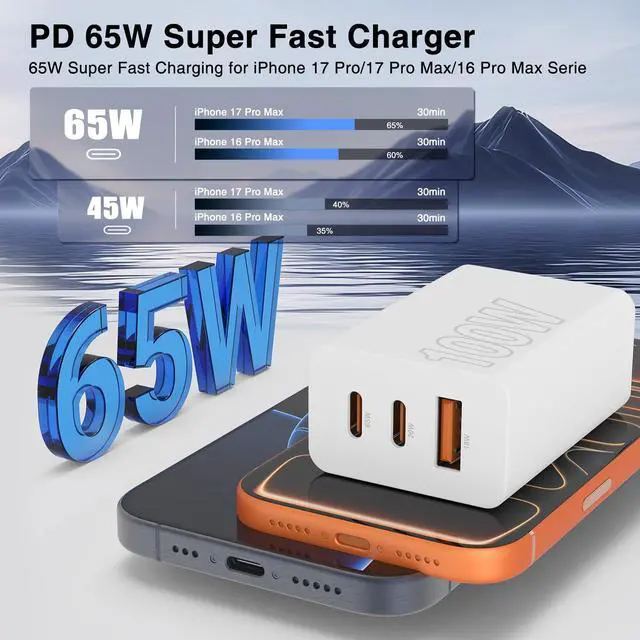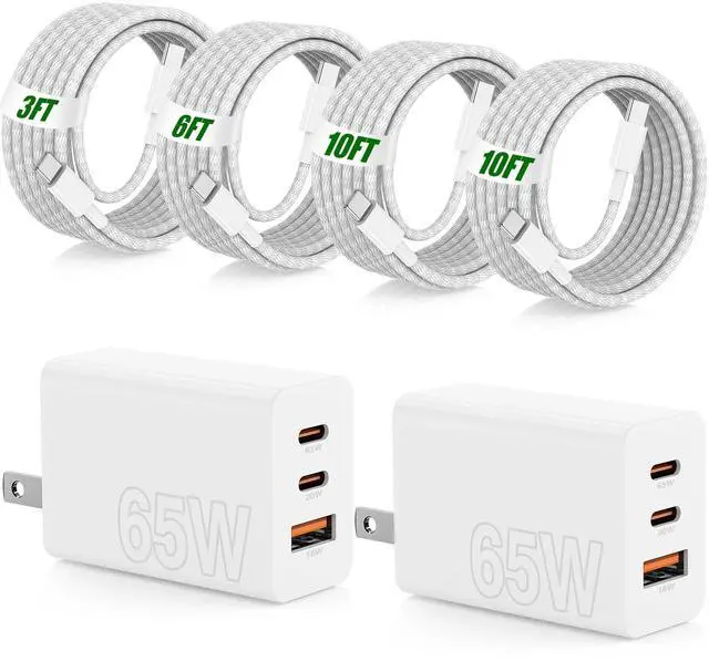 ![Main image of 65W Super Fast Charger USB C for iPhone 17 16 15 Pro Max,2Pack 100W [65W Max] 3-Port USB C Wall Charger Block & 3/6/10/10FT Braided Type C Cord for iPhone 17,MacBook iPad for Samsung Galaxy S26 Ultra](https://c1.neweggimages.com/productimage/nb640/C5AVD2603060Y8XW066.jpg)