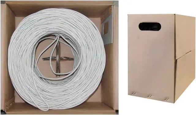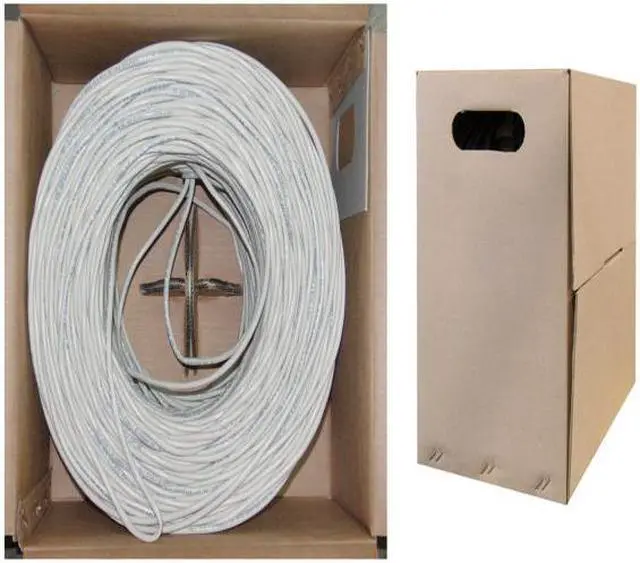 1000 foot Bulk Cat5e White Solid Ethernet Cable Pullbox, UTP (Unshielded Twisted Pair). This white bulk 1000 foot solid Cat5e Ethernet cable comes in an easy to use pull box and is ideal for the person looking to make longer permanent network runs during installation/expansion of network infrastructure. This particular cable is a white UTP (Unshielded Twisted Pair) solid cable. The individual conductors are 24 AWG (American wire gauge) solid pure copper. Pure copper conductors provide the best signal possible. Our Cat5e Ethernet cable exceeds the EIA/TIA-568-C standard.