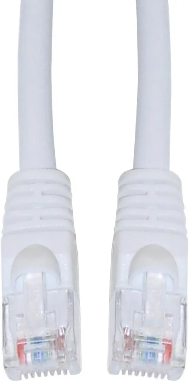 This particular cable is a white UTP (Unshielded Twisted Pair) patch cable with molded boots (snagless installation) and extra protection for the RJ45 connector and clip. The connectors are wired to the T568B standard. The individual conductors are 24 AWG (American wire gauge) stranded pure copper. Cat5e patch cables are stranded to improve flexibility. Pure copper conductors provide the best signal possible. The RJ45 plug features gold connectors to prevent corrosion thus ensuring a longer cable life. Our Cat5e Ethernet patch cables exceed the EIA/TIA-568-C standard.