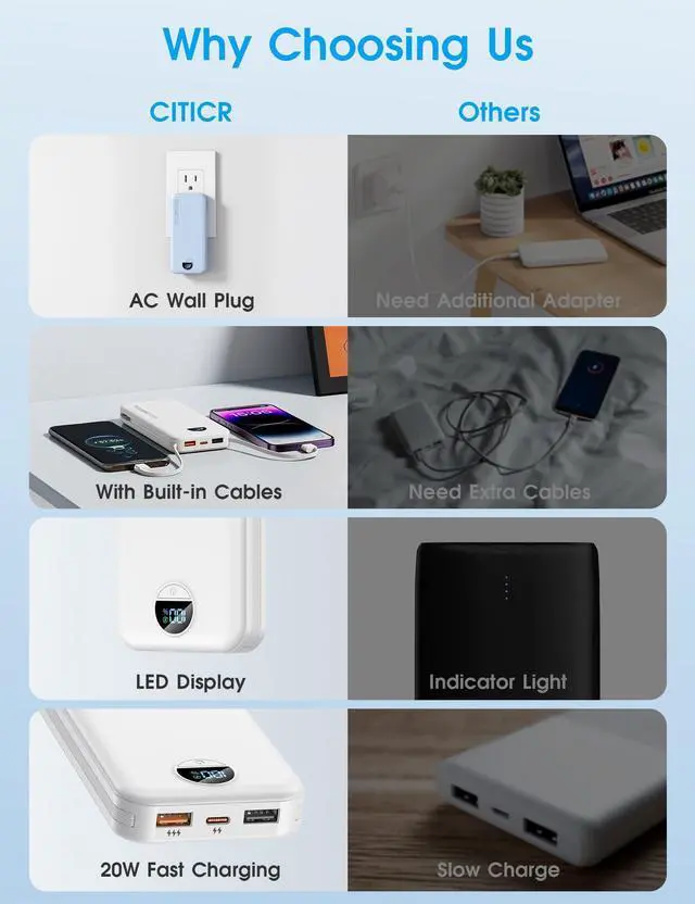 CITICR is a company focussed on the research of portable chargerwith built-in cables and wall plug. We have been selling power banks for more than ten years. Gathered a group of senior developers and mature production lines.