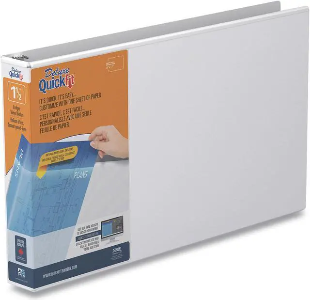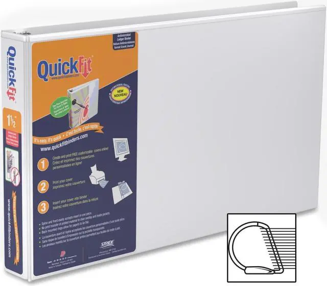 Its easy, its quick. Spine and front cover inserts can easily be added with a single piece of paper. No print transfer of printed material to clear overlay and inside pockets. Back-mounted rings lock and allow pages to lay flat. Free, customizable insert templates available at the QuickFit website. No ink transfer on overlay or inside pocket. Antimicrobial product protection to resist the growth of bacteria on the binder surface. PVC-free. Binder Type: Ring; Binder Style: View; Binder Size Capacity: 1.5"; Binder Sheet Capacity: 350.