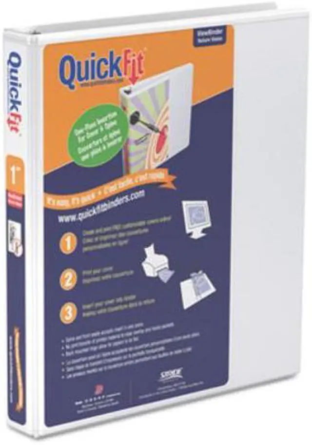 Attractive, durable view binder is ideal for important presentations. Easily customize the front and spine inserts with a single sheet of paper. Back-mounted rings allow pages to lie flat. Ink transfer resistant overlay. Convenient inside pockets provide space for regularly referenced materials. Free, customizable insert templates available at the QuickFit website. PVC-free. Binder Type: Ring; Binder Style: View; Binder Size Capacity: 1"; Binder Sheet Capacity: 200.