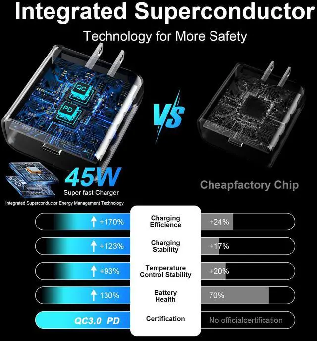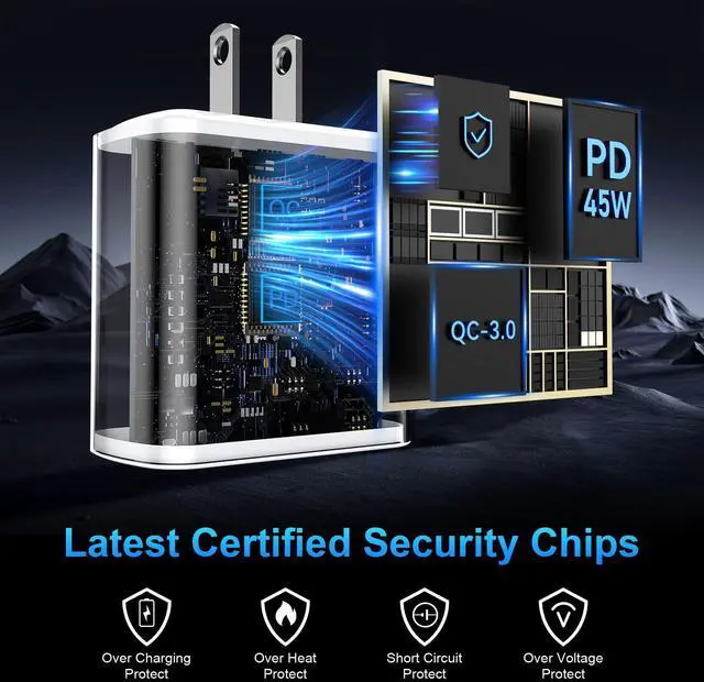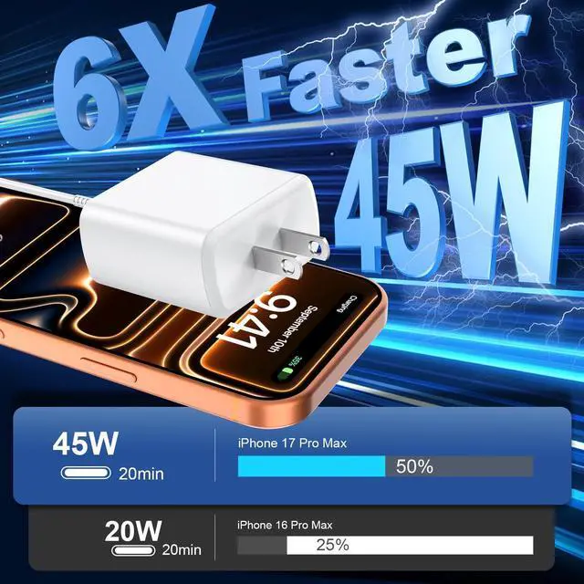 45W iPhone 17 Charger Fast ChargingThe 45W PD Super fast Charger iPhone 17 16 Charger fast charging block and 10ft extra long USB-C to C cable cord provide Max 45W output power, charge your iPhone 17 16 Pro Max up to 65% in just 30mins, 10% faster than the original 20W USB C charger
