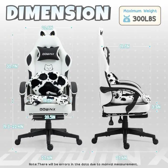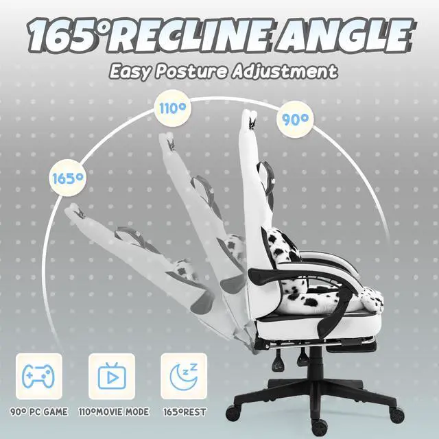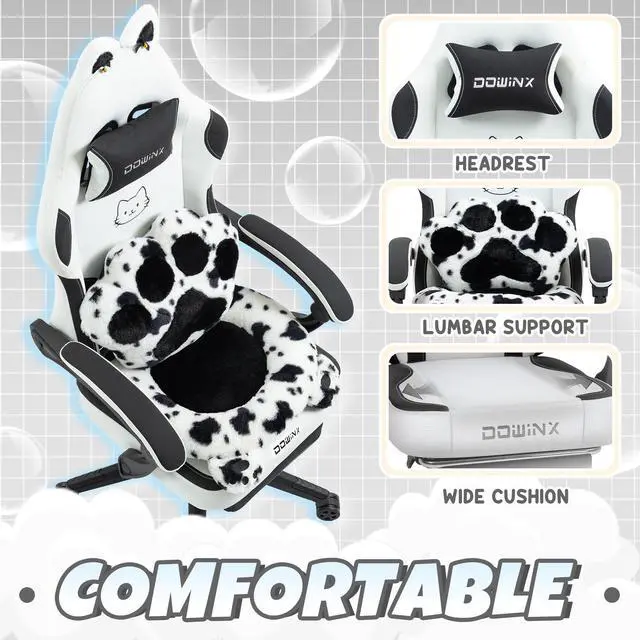 This gaming chair combines ergonomic support with playful design, featuring a cat-paw seat, detachable cat ears, and a high-resilience cushion. It offers 145-degree recline, synchronized armrests, and a retractable footrest, all covered in breathable fabric. The steel-frame backrest supports over 200 lbs. Comes with 24/7 support, 1-month replacement, and 1-year warranty.