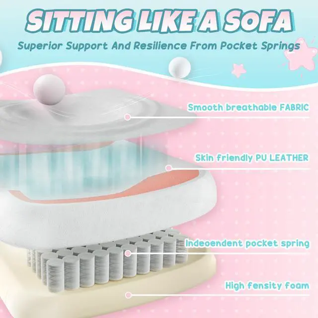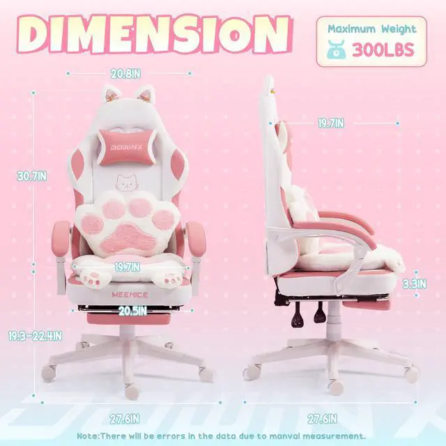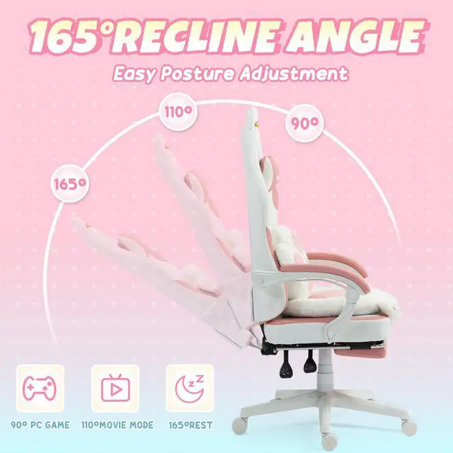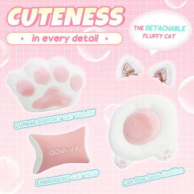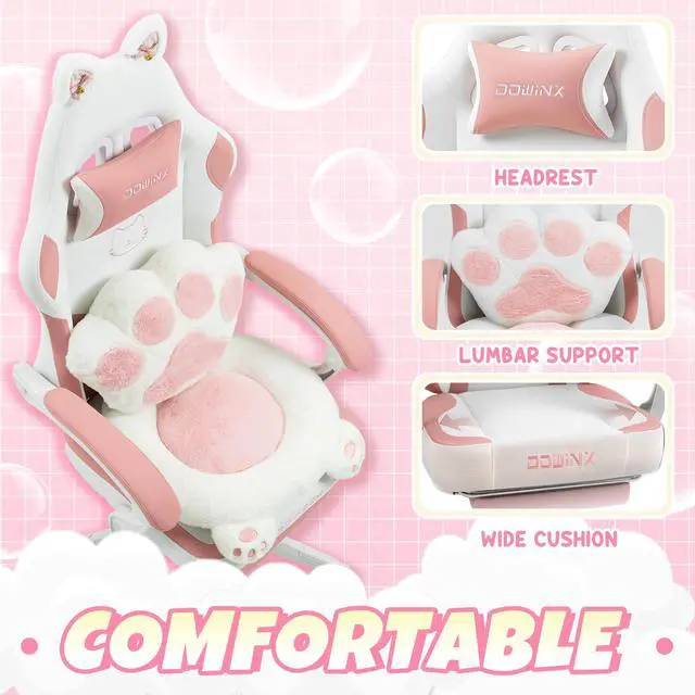 This gaming chair combines ergonomic support with playful design, featuring a cat-paw seat, detachable cat ears, and a high-resilience cushion. It offers 145-degree recline, synchronized armrests, and a retractable footrest, all covered in breathable fabric. The steel-frame backrest supports over 200 lbs. Comes with 24/7 support, 1-month replacement, and 1-year warranty.