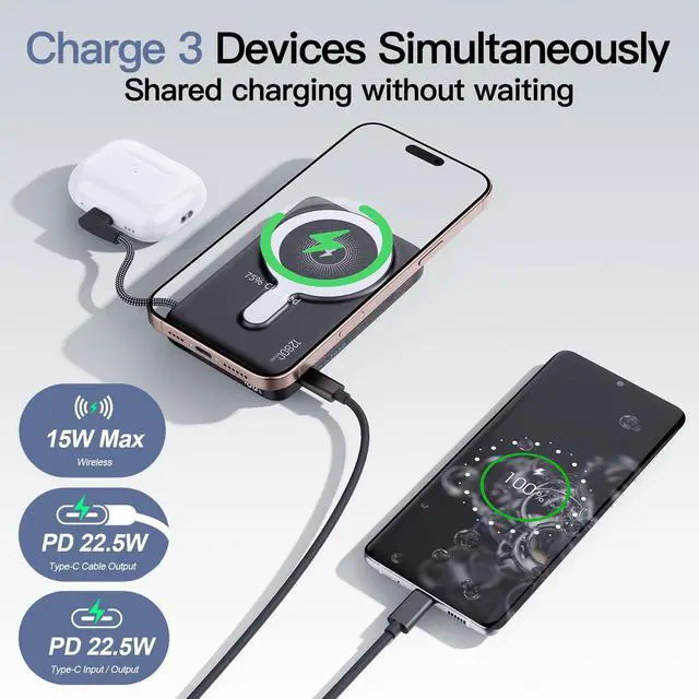 Powerful Fast Charging for All Your Devices: Get back to full power in no time with 22.5W wired fast charging via the integrated USB-C cable and 15W wireless fast charging. Whether you're an iPhone user (MagSafe compatible for iPhone 15/14/13/12 series) or an Android user with a USB C device, the M3 delivers rapid and efficient power. Its high-capacity 12800mAh Li-Polymer battery ensures multiple charges for your smartphones and other gadgets.