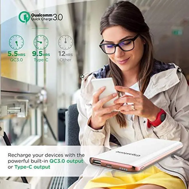 Gigastone 10000mAh USB C Power bank Ultra slim portable charger Dual port quick Charge QC 3.0 Type C Output 3A Battery pack compatible with Apple iPhone XS/XS Max Nintendo Switch iPad Samsung Galaxy Tablets Android smart phones.