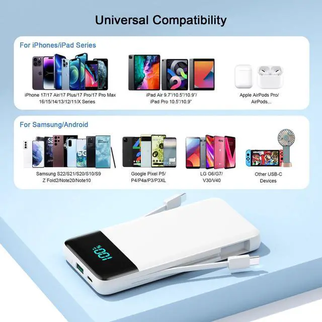 | Compatibility | iPhone 17/16/15/14/13/12/11/X/8/7/6/SE all series, Android, Samsung-Galaxy S25/S24/S23, Google Pixel, Tablets, Earbuds, Smartwatches & more USB-powered devices. |