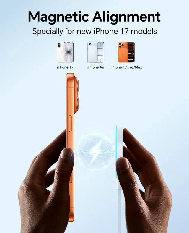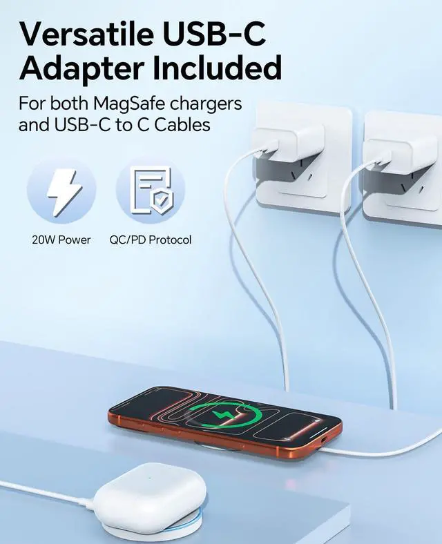 Ultra-Fast 15W Charging50% in 30 Mins: Delivers 3x faster charging vs. standard 5W chargers50% battery in 30 minutes for iPhone 16/17 series. Includes 2 wireless pads, 2 adapters, and 2 USB-C cables (6FT) for flexible setups at your desk, bedside, or car