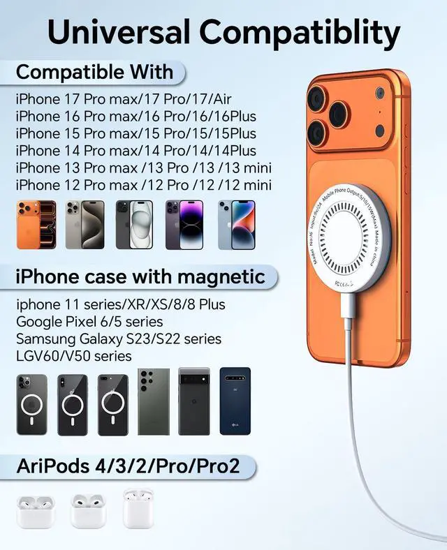 Universal Apple CompatibilityFast Charging for iPhone 17-12 Series & AirPods: Works flawlessly with iPhone 12/13/14/15/16/17 series (including Pro/Max/Air models) and AirPods Pro 2/3 (wireless case required). Perfect for home, office, or travelseamlessly power up all your Apple essentials
