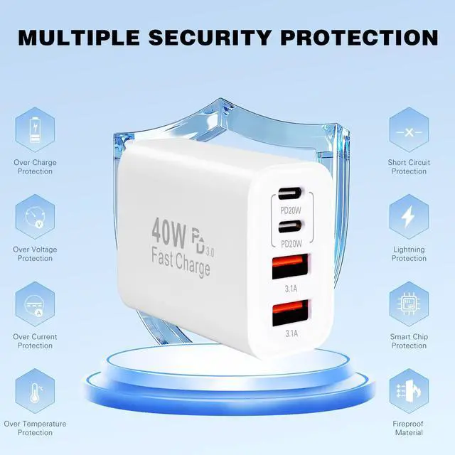 Multiport Charger Certified RoHS,CE & FCC,Protect Devices from Over-Heated and Over-Currents,Over-Charging,and Short Circuits,Charging Will be Automatically Stopped When the Battery is Full.The 4-Port Charger Fast Charging Block Featured With ABS + PC Fireproof Material,You Can Make Sure Your Digital Devices are Always Safe Charge.