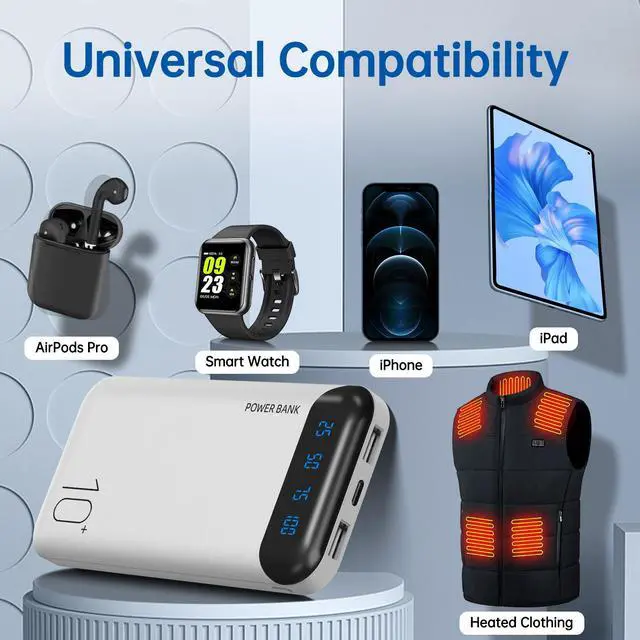 UNIVERSAL COMPATIBILITYCell phone Portable Battery Charger Compatibile with iPhone 16, 15,14 Pro MAX, 13, 12, 11 XR/X, Samsung Galaxy, Google Pixel, Huawei, Xiaomi, iPads, AirPods, LG, Android smartphones, earbuds, Tablet, headphone, speaker, fitness tracker, smart watch and other USB-charged electronic devices. And the power bank also can charge heating vests and some smart wear.