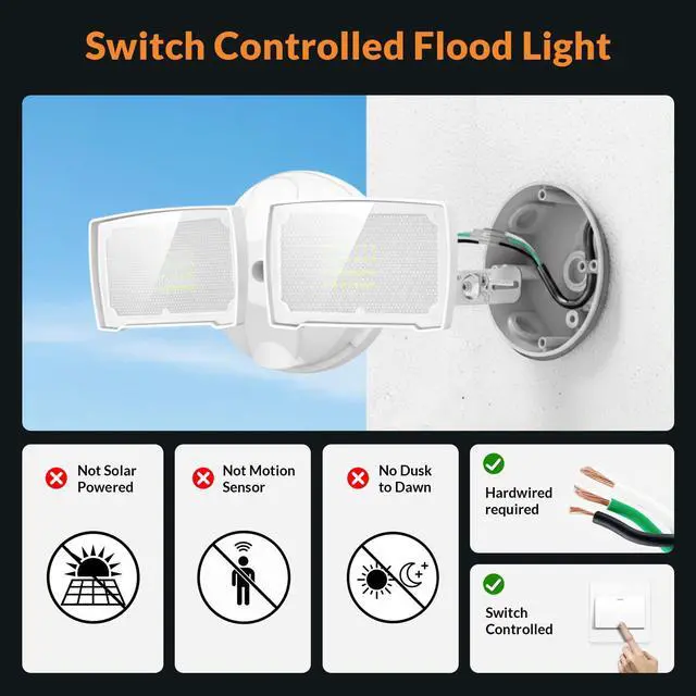 Simply mount the wired light to a junction box by following a few simple wiring steps. This flood light can be wall-mounted, not fit for uneven soffit/ceiling/eaves, it brings extra safety to your home.