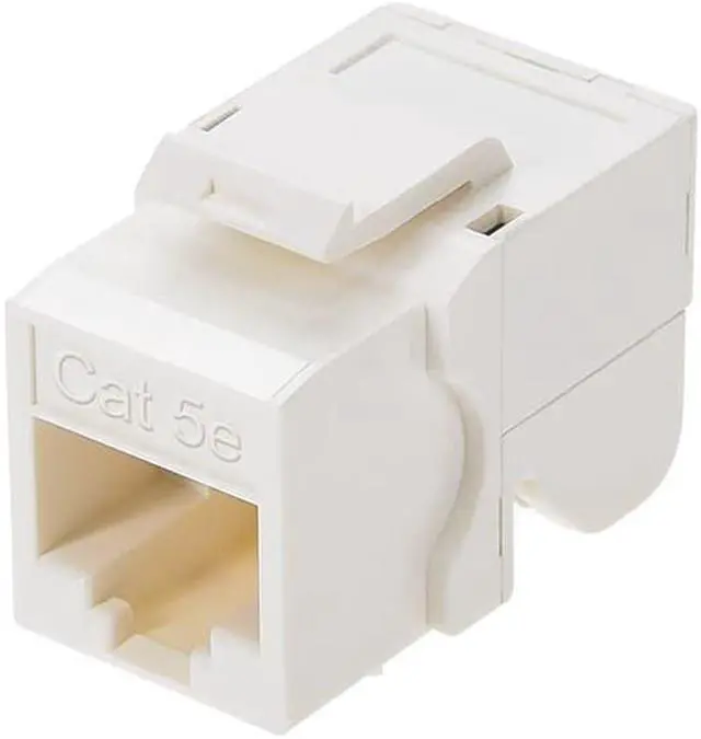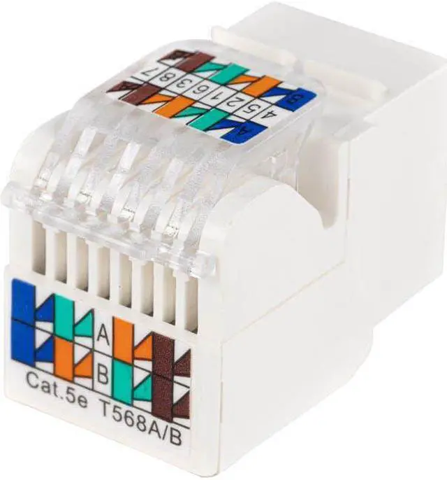 Easy to use, toolless (no soldering or screwdriver req. ) modular CAT 5e Keystone jack. RJ45 female connector. To be used with keystone wall plate or panel. Wiring diagram on clip.