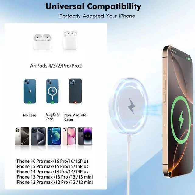 Our MagSafe Charger features advanced built-in magnets that instantly snap and lock your device into the perfect charging position.No slipping or misalignmentyour phone stays securely attached even during movement,ensuring efficient charging every time.