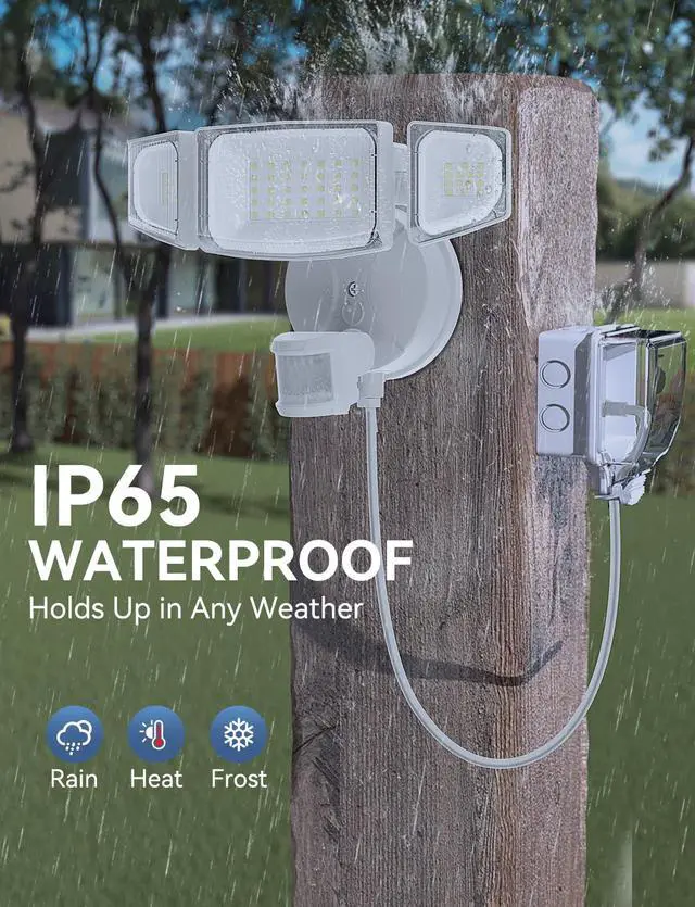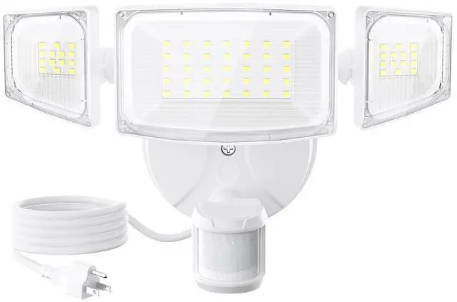 The motion detector model delivers 5000 lumens (1150 ft² coverage) and 3 adjustable heads for customizable light direction.