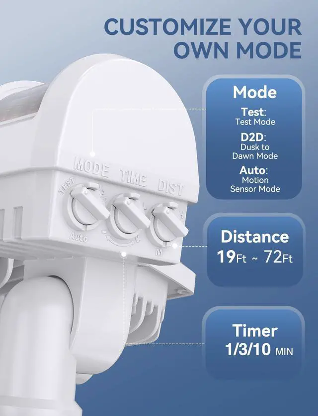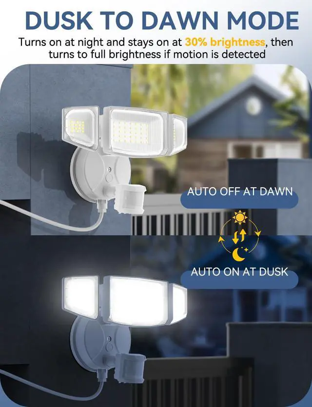 Motion Sensor Mode: Light turns on only when motion is detected—no wasted illumination.Dusk-to-Dawn Mode: 30% brightness overnight, instant full brightness when motion is sensed, auto-off at sunrise.
