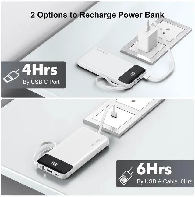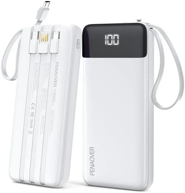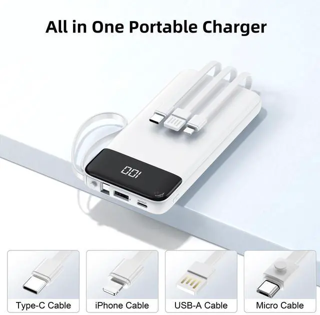 Power Bank with Built in Cables: This slim power bank with 4 built in cables: 3 output charging cables( iPhone cable, type c cable, Micro cable) and 1 input USB A cable. These built-in cables can charge most smart devices, such as smartphones, tablet, headphone and micro devices. No need to carry extra cables or adapters to charge your devices, travel essentials.