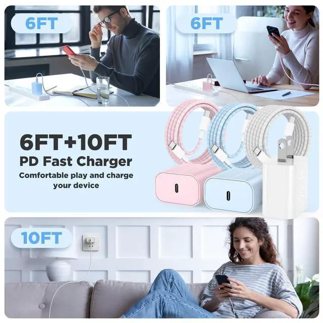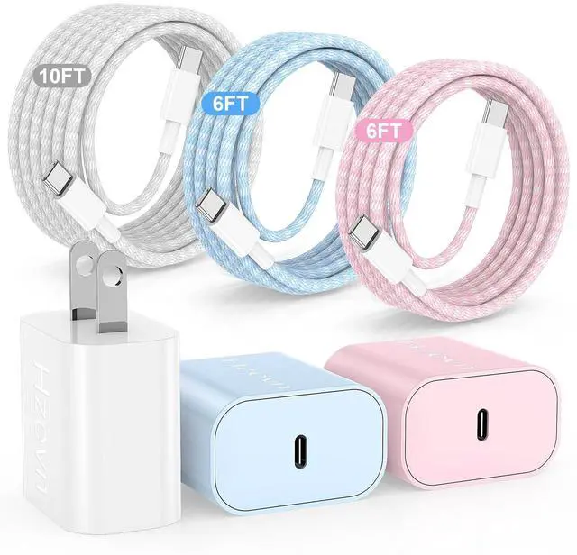 What You Get : 3Pack 20W USB C Wall Charger and 3Pack 6/6/10FT USB C to C Cable - Pink/Blue/White