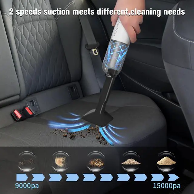 Powerful 15000Pa Suction for Effective CleaningThe PINXC hand held vacuum cordless rechargeable cleaner delivers 15000Pa strong suction with an upgraded high-speed brushless motor, making it ideal for car interiors, home surfaces, and pet hair removal. With car vacuum cleaner high power, it tackles stubborn dirt, dust, and debris. Two suction modes of 9000Pa and 15000Pa are available to meet your different cleaning tasks.