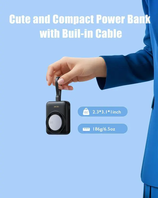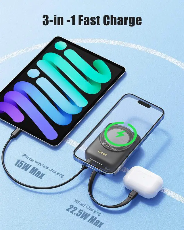 The convenient way to chargeSimply attach this Magnetic compatible battery to your iPhone 12~16 series for 15W fast magnetic wireless charging. Our built-in 22.5W USB-C cable quickly charges your iPhone to 50% in 32 minutes. It also supports pass-through charging, so you can charge your phone and battery at the same time.